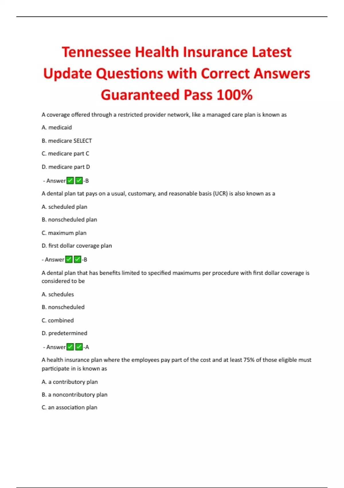 Tennessee Health Insurance Latest Update Questions with Correct Answers Guaranteed Pass 100%