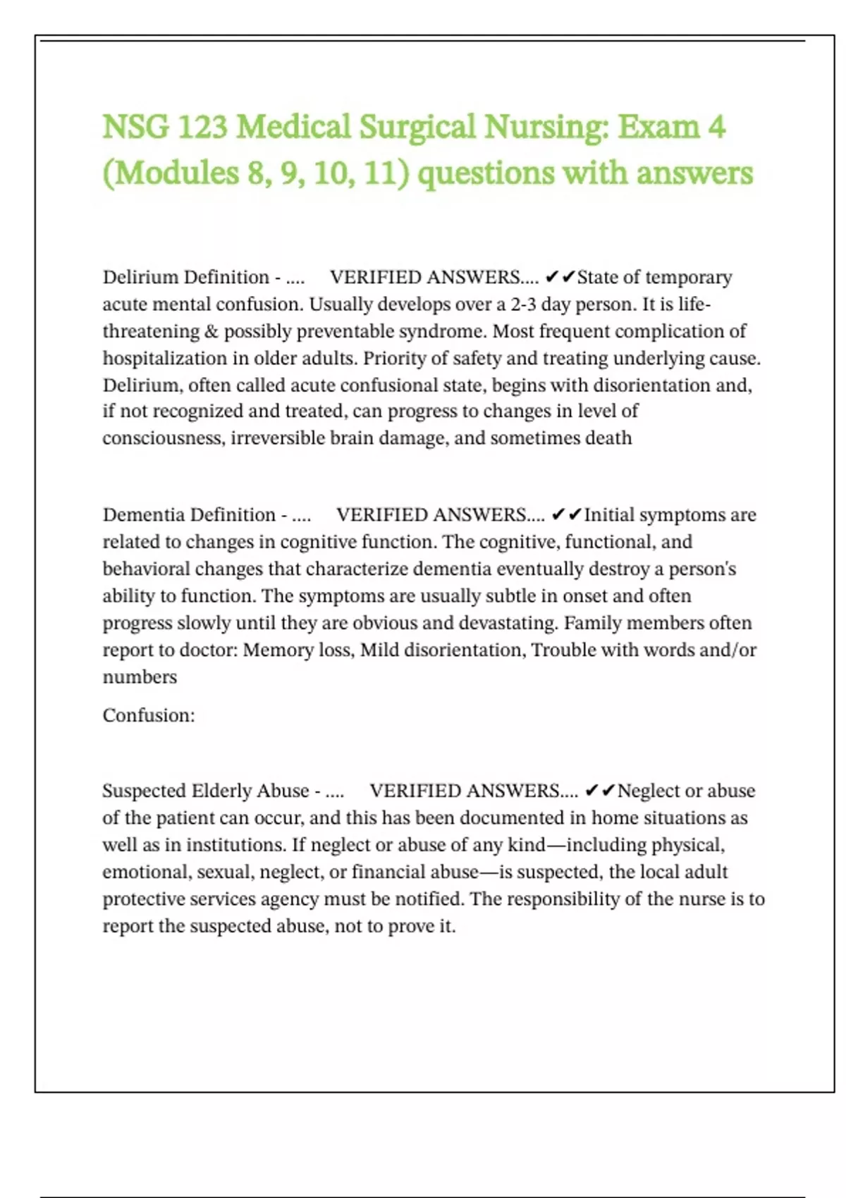 NSG 123 Medical Surgical Nursing Exam study pack
