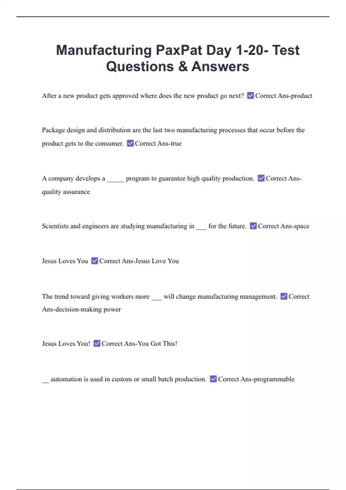 Manufacturing PaxPat Day 1-20- Test Questions & Answers 2 Exam (elaborations) Manufacturing PaxPat Day 1-7 Questions & Answers 3 Exam (elaborations) Manufacturing PaxPat- Test Questions & Answers 4 Exam (elaborations) Manufacturing PaxPat Entire Module- Questions & Answers