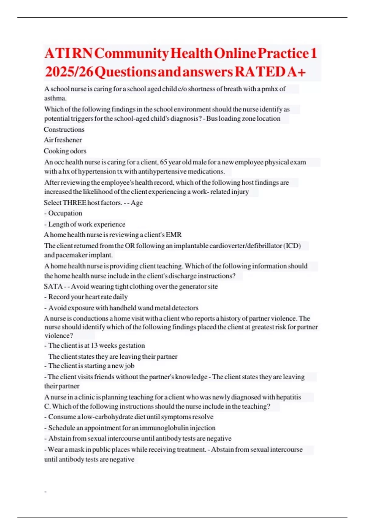 Exam (elaborations) ATI RN Community Health Online Practice 1 2025/26 Questions and answers RATED A+ 2 Exam (elaborations) ATI RN Community Health Online Practice 2 2025/26 Question and answers Updated Rated A+ 3 Exam (elaborations) ATI RN Community Health Online Practice 3 2025/26 With complete Questions and answers Updated 4 Exam (elaborations
