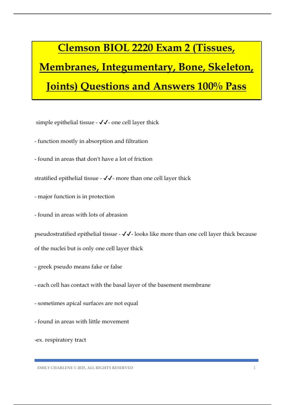 Clemson BIOL 2220 Exam 2 (Tissues, Membranes, Integumentary, Bone, Skeleton, Joints) Questions and Answers 100% Pass