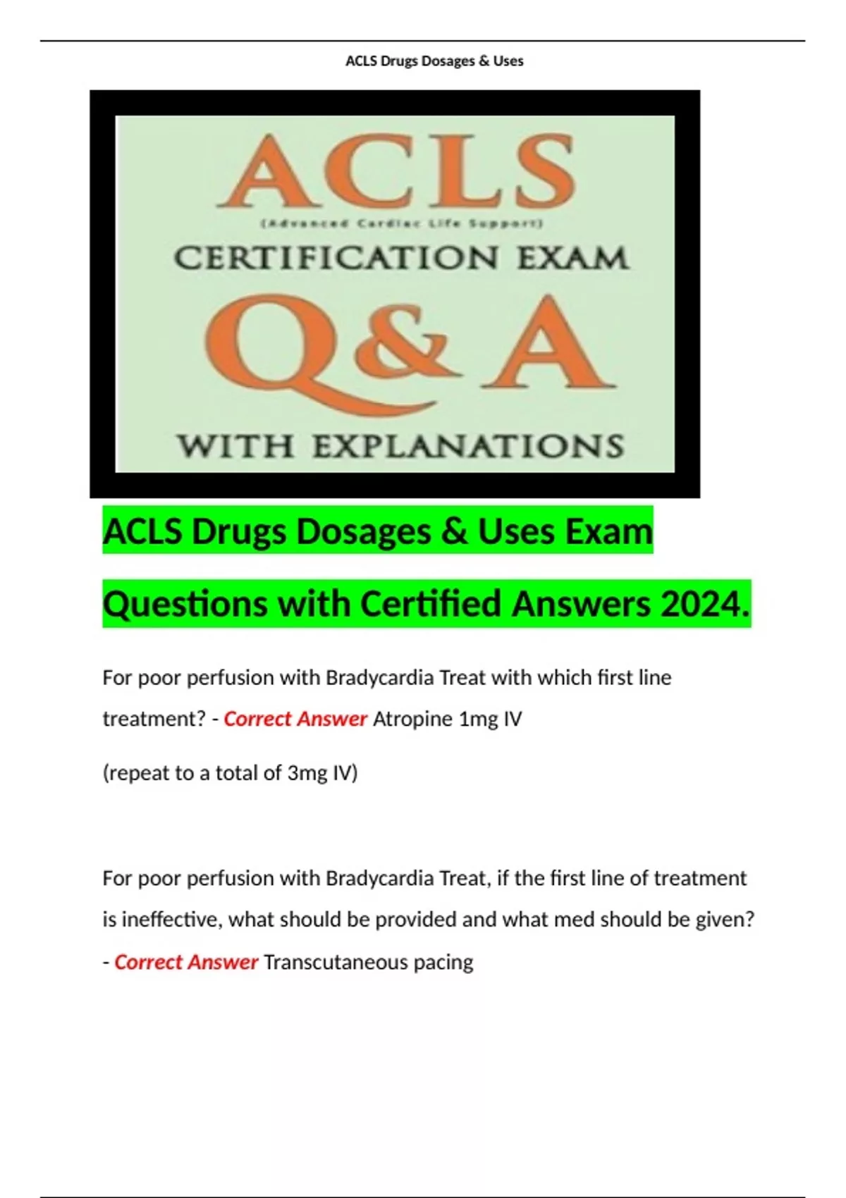 1 Exam (elaborations) ACLS Drugs Dosages & Uses Exam Questions with Certified Answers 2024. 2 Exam (elaborations) ACLS Exam Questions & Answers Well Answered 2024. 3 Exam (elaborations) ACLS Review Questions with Verified Response Assured A Plus Score. 4 Exam (elaborations) ACLS Study Guide Quiz Reviewed with Best Analysis 2024
