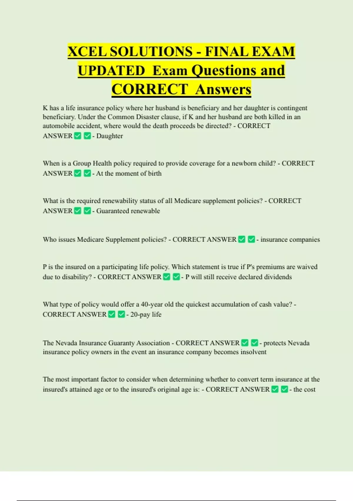 XCEL Solutions Life Insurance Final Exam UPDATED Exam Questions and CORRECT Answers