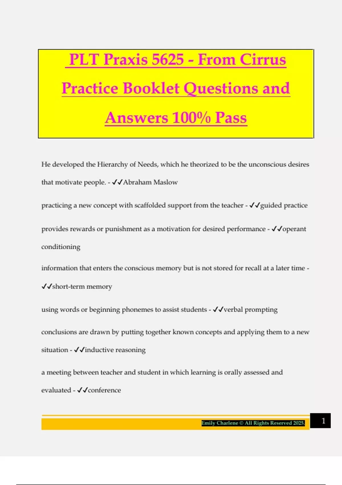 PLT Praxis 5625 - From Cirrus Practice Booklet Questions and Answers 100% Pass