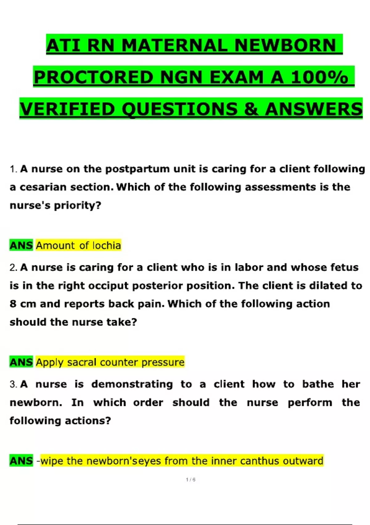 ATI RN MATERNAL NEWBORN PROCTORED EXAM A, B , EXAM & RETAKE A+ VERIFIED QUESTIONS & ANSWERS ATI RN MATERNAL NEWBORN PROCTORED EXAM B A+ VERIFIED QUESTIONS & ANSWERS ( PACKAGE DEAL )