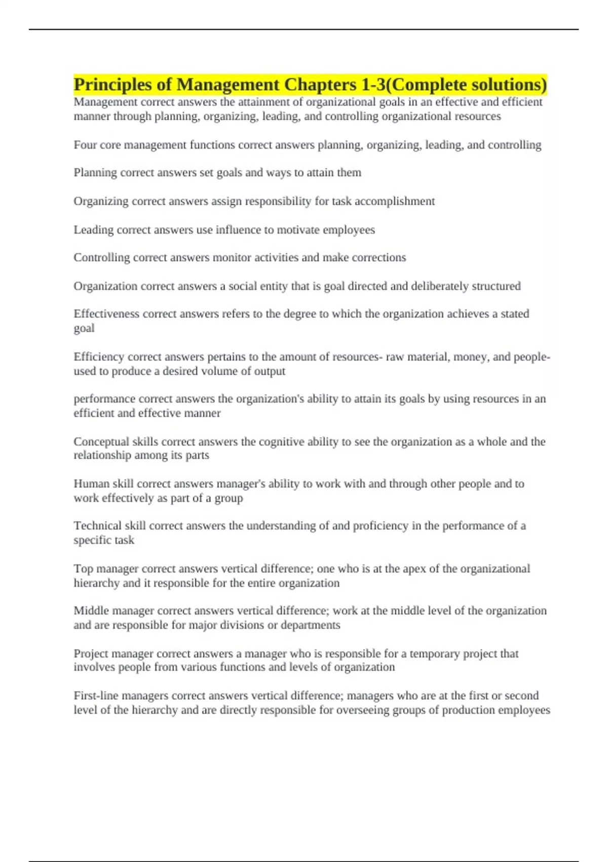 Principles of Management Chapters 1-3(Complete solutions) Principles of Management Exam Questions(Correctly solved) Principles of Management - Module 1: Introduction to Management(100% Guaranteed) Unit 6 Principles of Management(A+ Guaranteed Answers) Principles of Management (Chapter 1-5)( All Accurately solved)