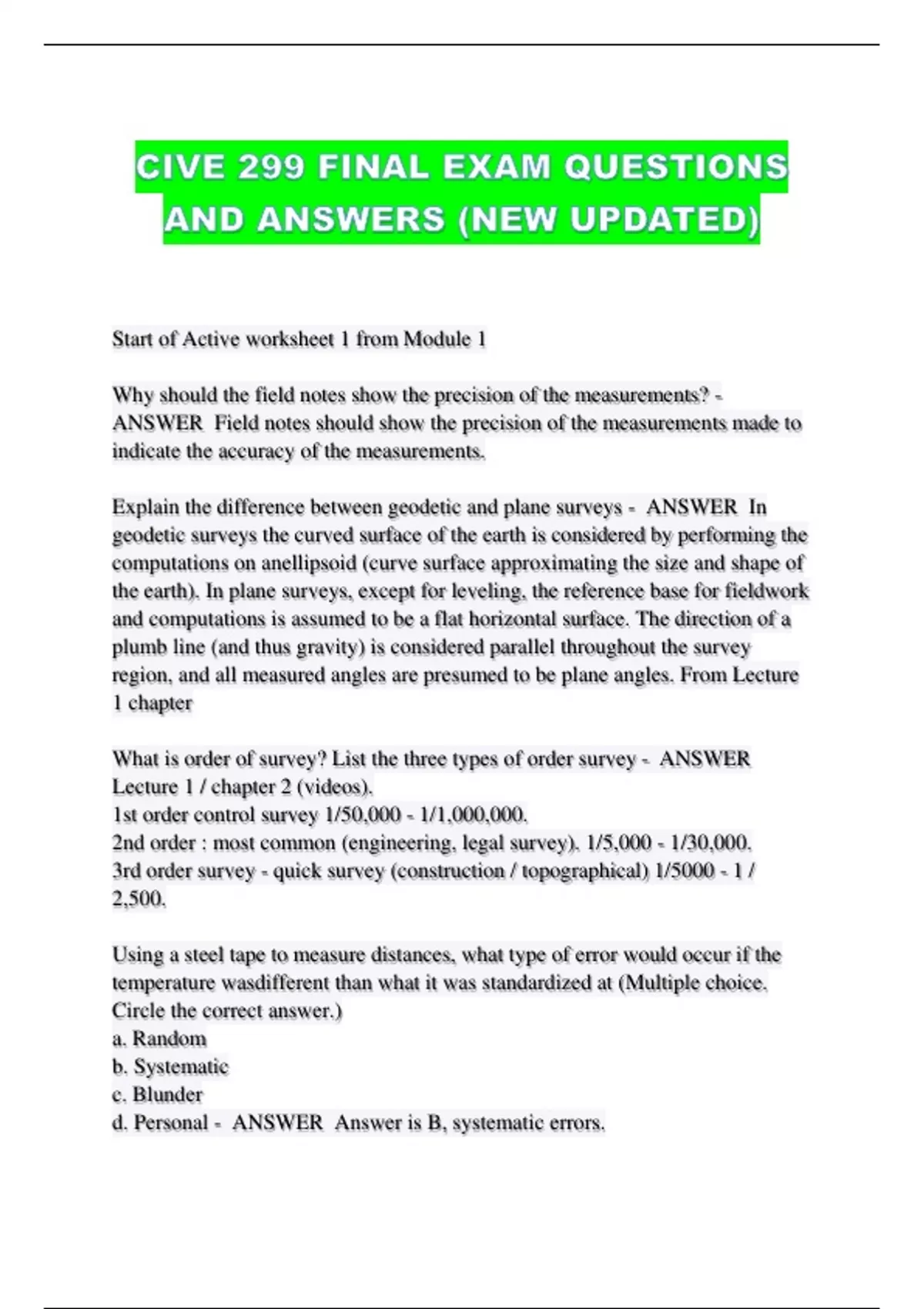 CIVE 299 FINAL EXAM QUESTIONS AND ANSWERS (NEW UPDATED)