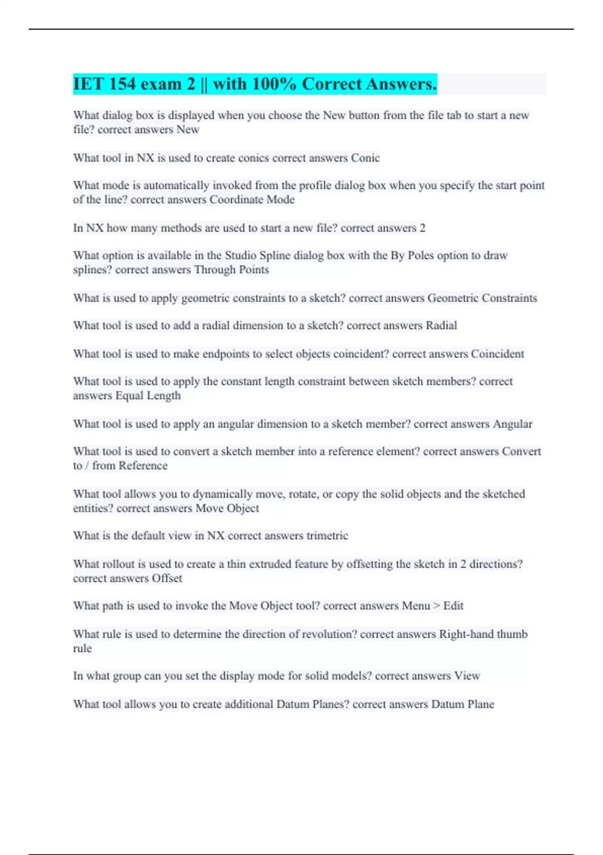 IET 154 exam 2 || with 100% Correct Answers. IET 154 Exam #1 || A+ Graded Already. IET 154 Exam 1 Central Michigan University || with A+ Guaranteed Solutions. IET154 Final Exam Review || All Questions Answered Correctly. IET 154 Seimen s NX 9 for Designers || with 100% Errorless Solutions. IET 154 NX Questions || with 100% Accurate Solutions. IET 1