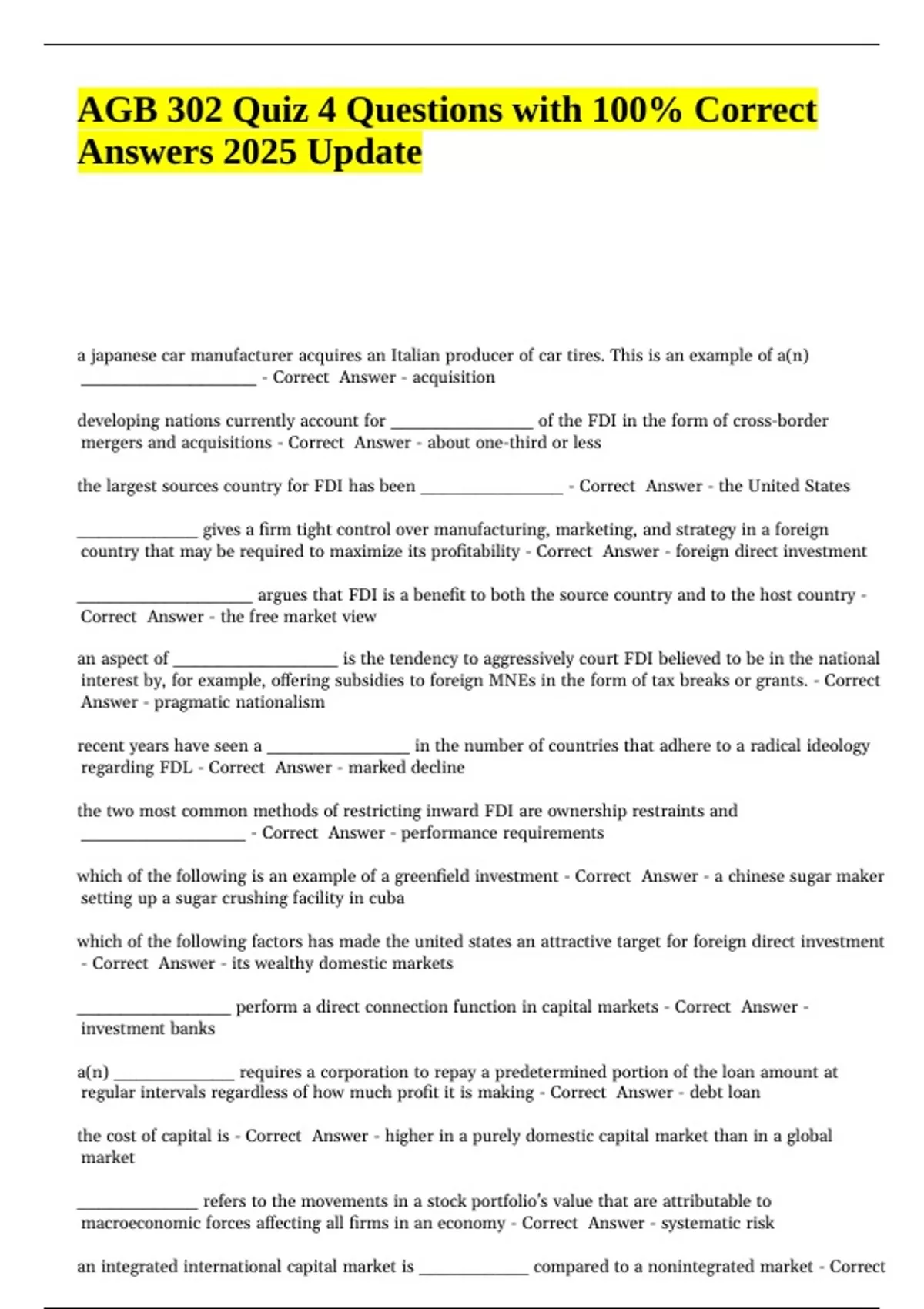 AGB 302 Quiz 4 Questions with 100- Correct Answers 2025 Update.