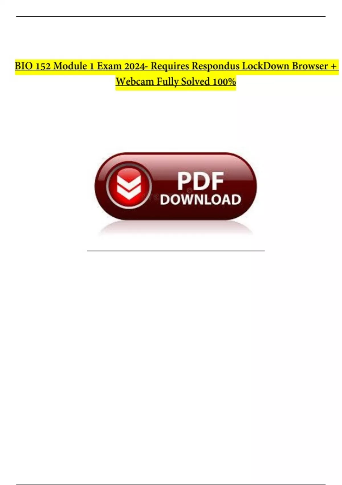 1 Exam (elaborations) BIO 152 Module 1 Exam 2024- Requires Respondus LockDown Browser + Webcam Fully Solved 100% 2 Exam (elaborations) BIO 152 Module 2 Exam 2025- Requires Respondus LockDown Browser + Webcam 100% Correct 3 Exam (elaborations) BIO 152 Module 3 Exam 2024- Requires Respondus LockDown Browser + Webcam 100% Correct 4 Exam (elaboratio