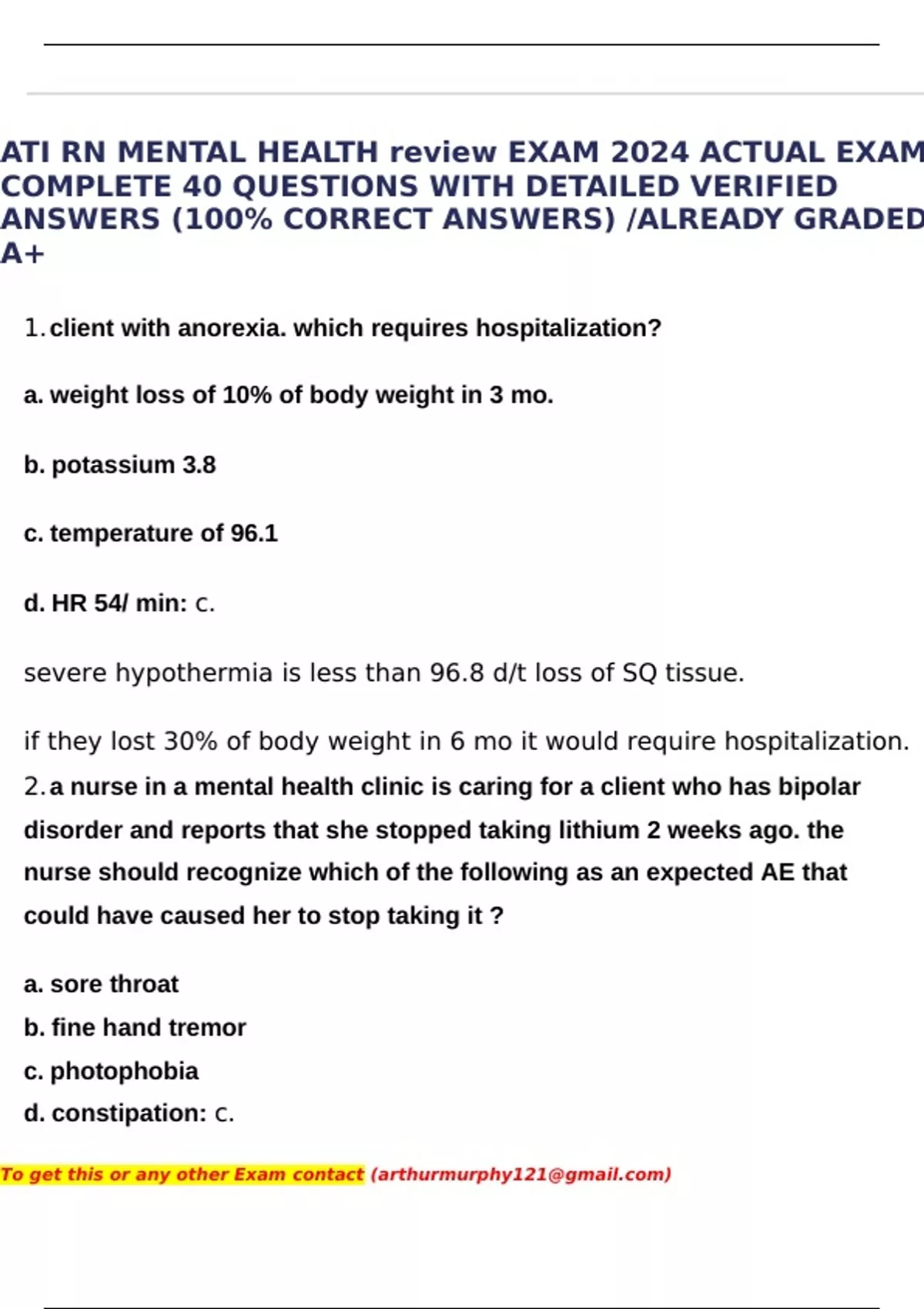 ATI RN MENTAL HEALTH review EXAM 2024 ACTUAL EXAM COMPLETE 40 QUESTIONS WITH DETAILED VERIFIED ANSWERS (100% CORRECT ANSWERS) /ALREADY GRADED A+
