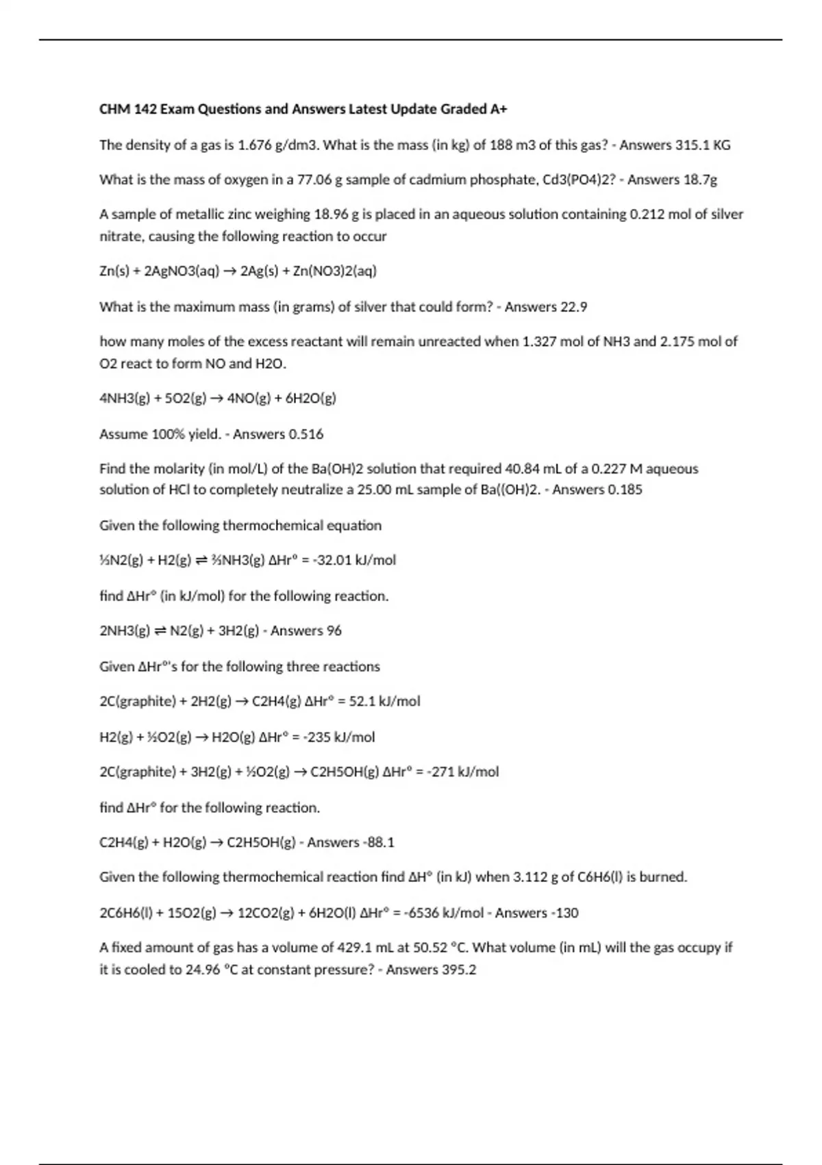 CHM 142 Exam Questions and Answers Latest Update Graded A+