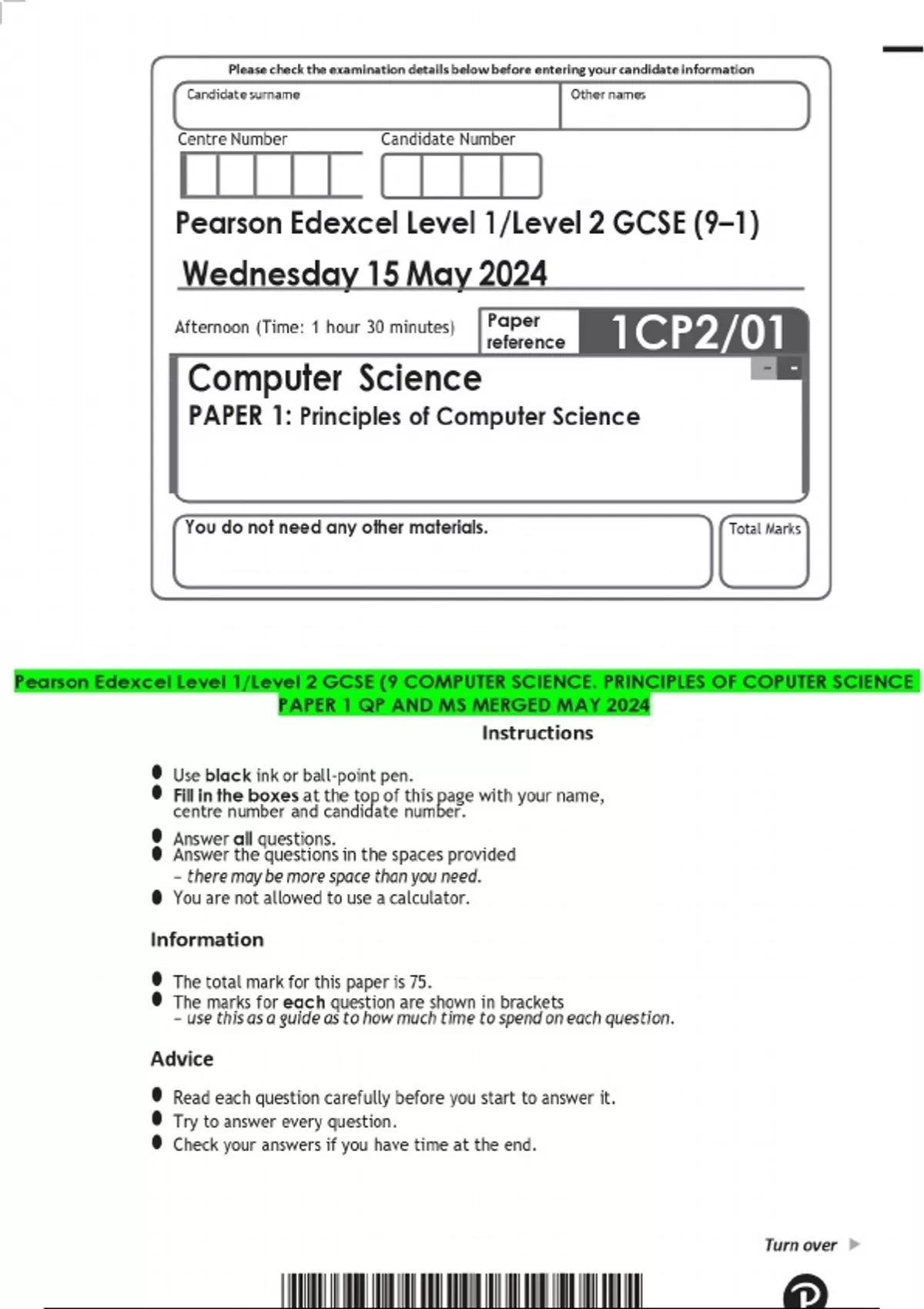 Pearson Edexcel Level 1/Level 2 GCSE (9 COMPUTER SCIENCE. PRINCIPLES OF COPUTER SCIENCE PAPER 1 QP AND MS MERGED MAY 2024