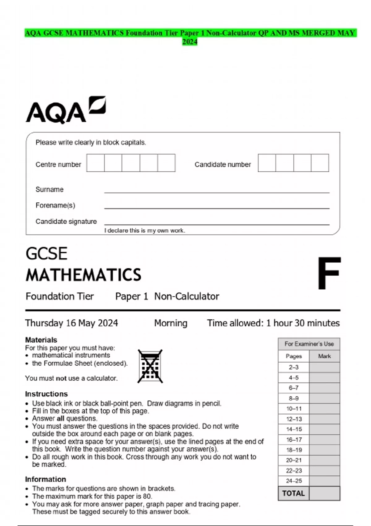 AQA GCSE MATHEMATICS Foundation Tier Paper 1 Non-Calculator QP AND MS MERGED MAY 2024