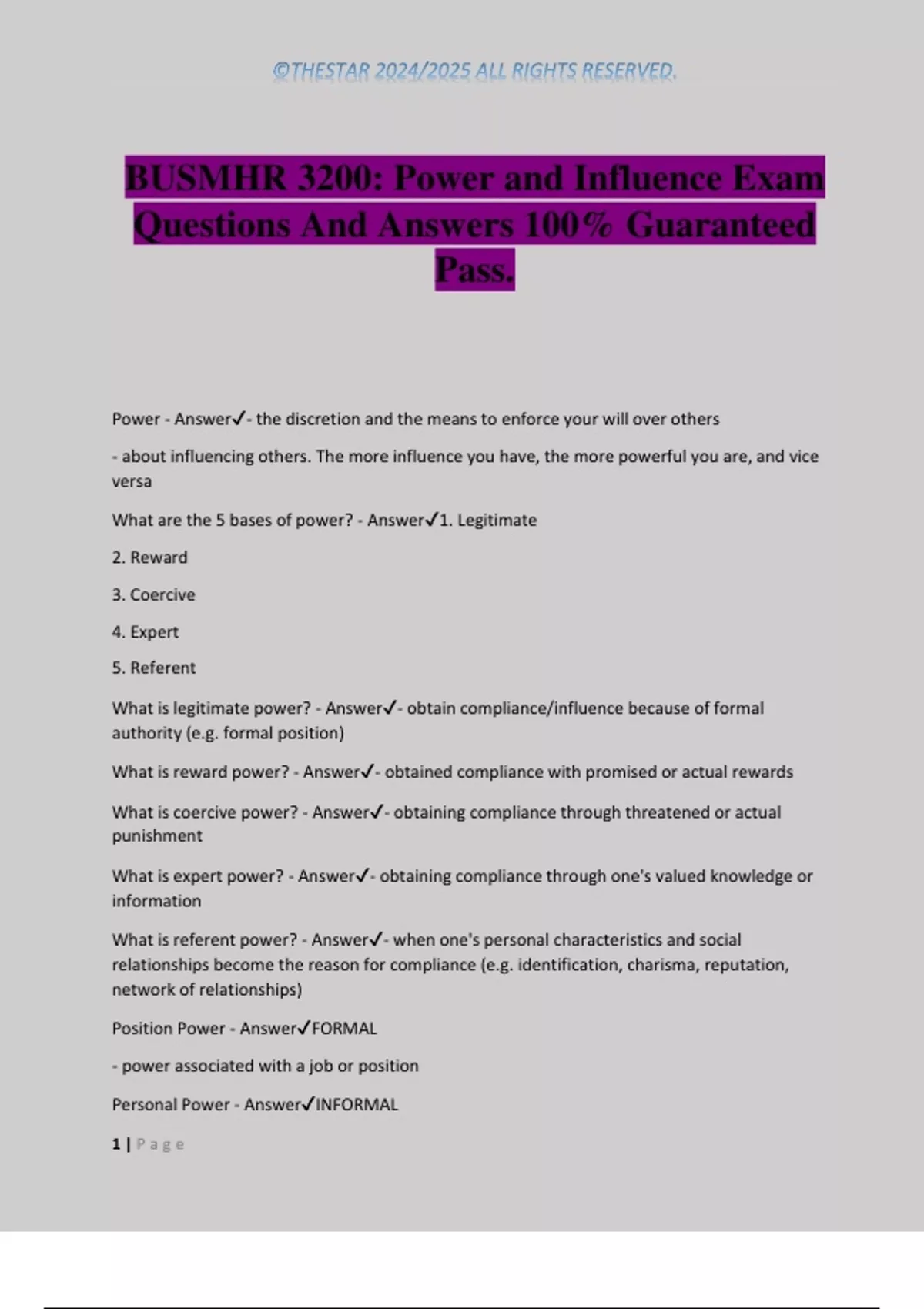 BUSMHR 3200: Power and Influence Exam Questions And Answers 100% Guaranteed Pass.