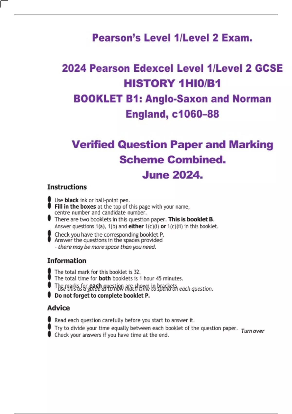 2024 Pearson Edexcel Level 1/Level 2 GCSE HISTORY 1HI0/B1 BOOKLET B1: Anglo-Saxon and Norman England, c1060–88 Verified Question Paper and Marking Scheme Combined. June 2024.