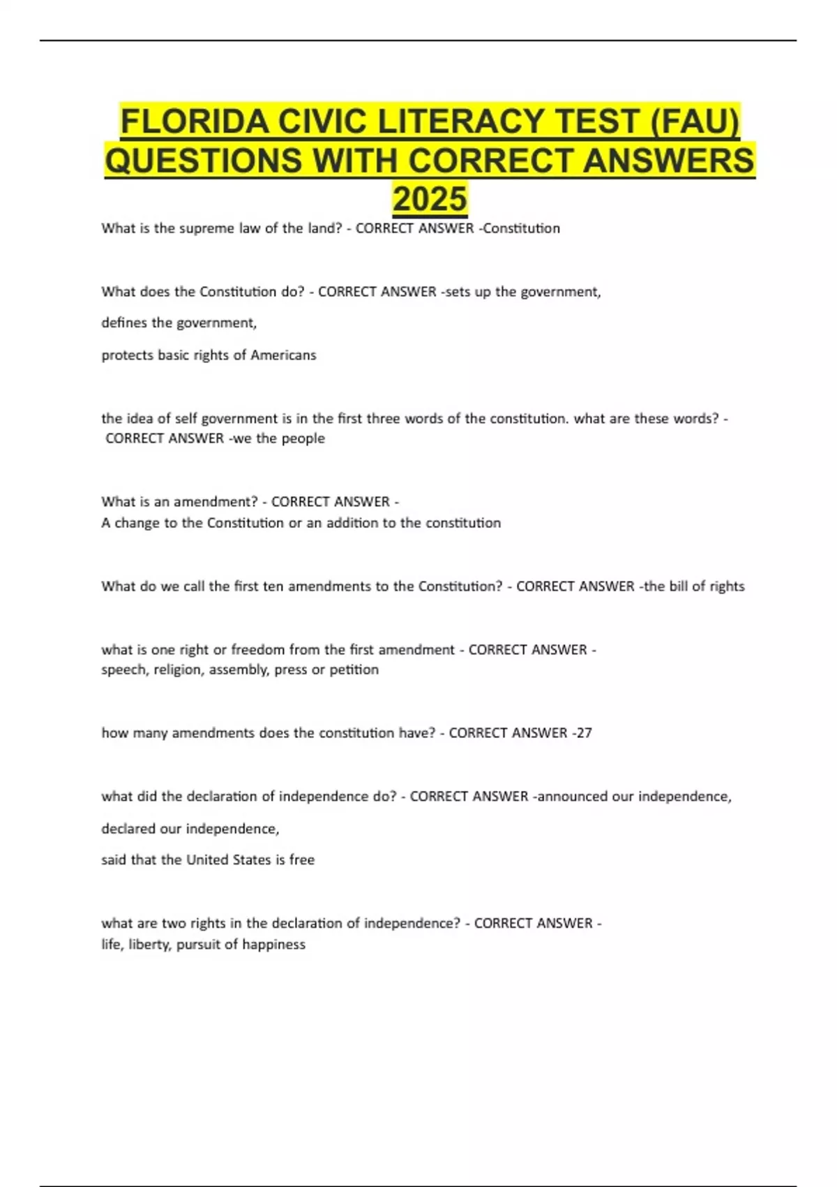 FLORIDA CIVIC LITERACY TEST (FAU) QUESTIONS WITH CORRECT ANSWERS 2025