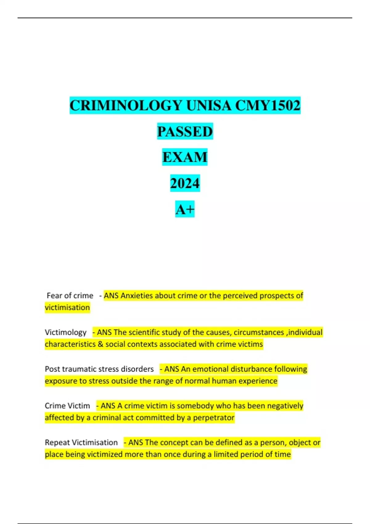 Your one-stop resource for high-quality, exam-focused study materials. Here, you'll find expertly crafted summaries, past exam papers, notes, and assignments tailored to help you succeed in your courses. Every document is written with clarity, accuracy, and exam performance in mind—saving you hours of studying and helping you boost your grades. ✅ Clear and well-structured content ✅ Covers key exam topics and common questions ✅ Trusted by students for academic success ✅ Instant downloads and affordable prices Whether you're cramming for finals or just staying ahead in class, my materials are designed to make your studying smarter, not harder. Take a look around and get the edge you need!