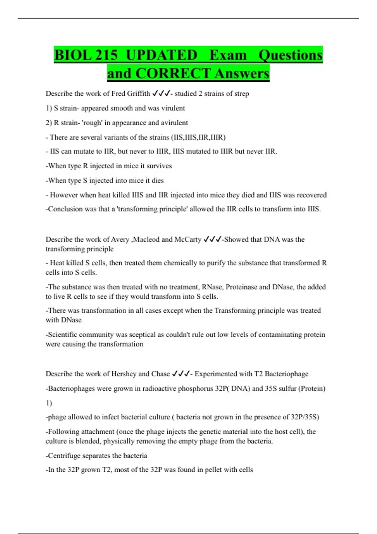 Bio 215 Bundled Exam Questions and CORRECT Answers