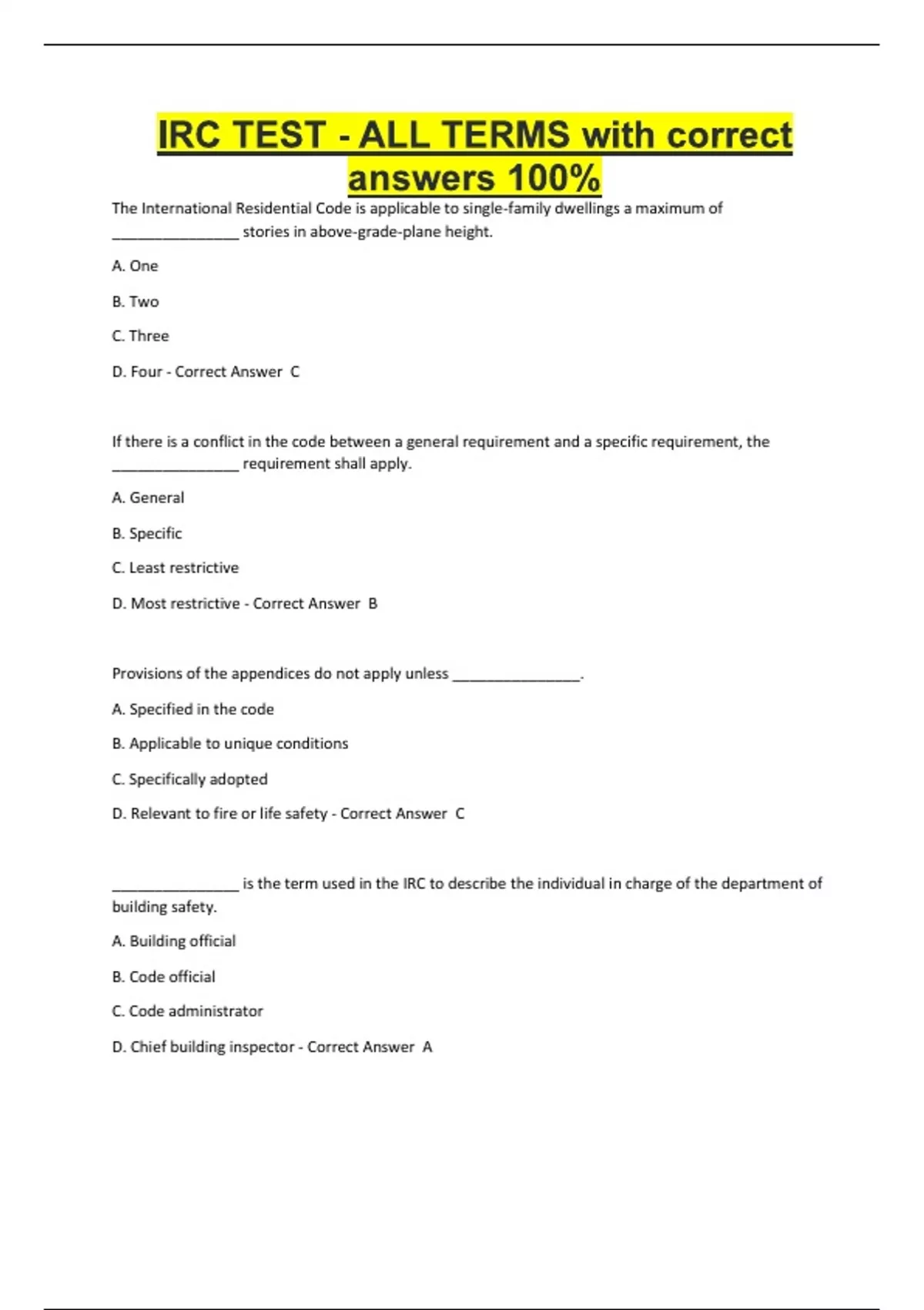 IRC TEST QUESTIONS with correct answers 100% what is the minimum size waste trap that can be used for a shower. - Correct Answer 1.5 (709.1) (p.65) the minimum required diameter of stack vents and vent stacks of a system with a developed length of 300 feet and total of 42 drainage fixture units connected thereto, is ____________ inch. - Correct A