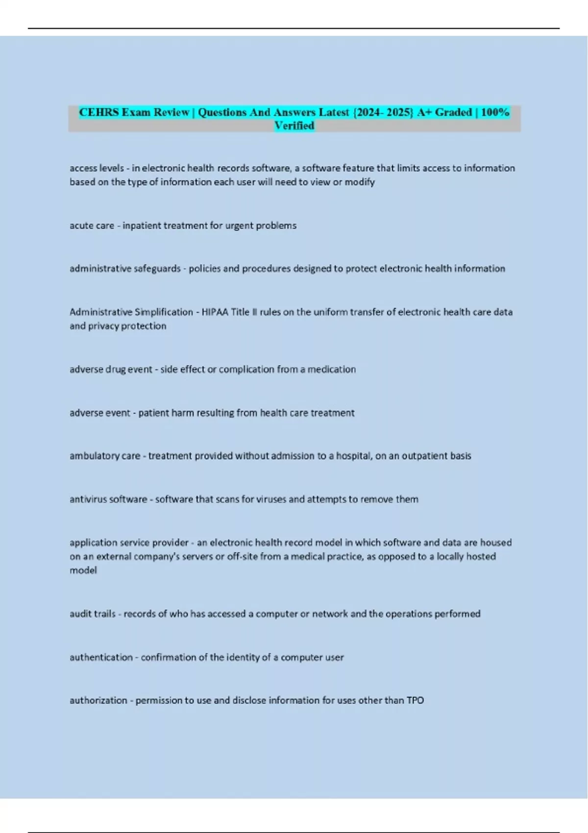 CEHRS Exam | Questions And Answers 2 Exam (elaborations) CEHRS Exam | Questions And Answers 3 Exam (elaborations) CEHRS Exam Review | Questions And Answers 4 Exam (elaborations) CEHRS Final Exam | Questions And Answers 5 Exam (elaborations) CEHRS NHA 22 Final Exam | Questions And Answers