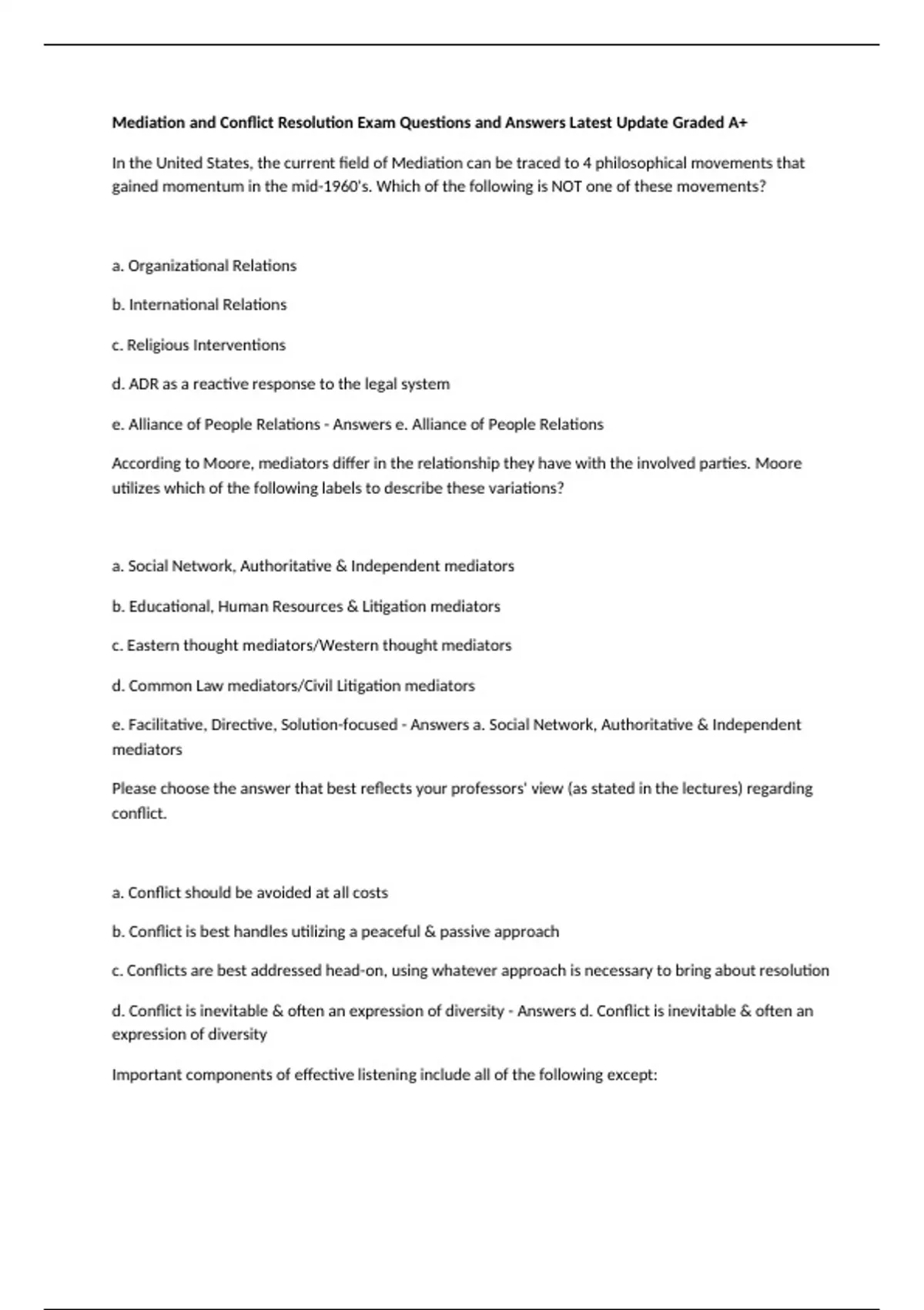 Mediation and Conflict Resolution Exam Questions and Answers Latest Update Graded A+