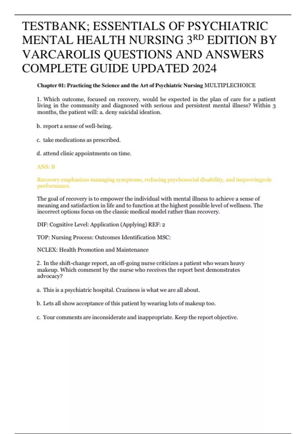 ESSENTIALS OF PSYCHIATRIC MENTAL HEALTH NURSING BY VARCAROLIS QUESTIONS AND ANSWERS COMPLETE GUIDES