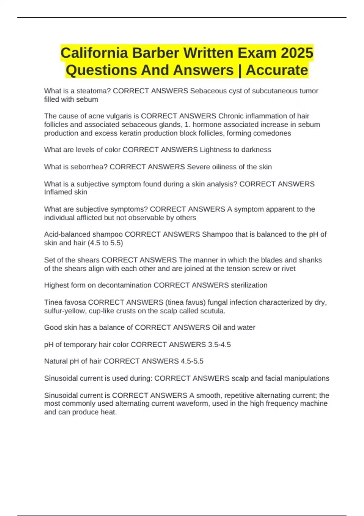 Barber Practice State Board Exam Solved Correctly To Score A+ 2025 Verified Barber Final Exam 2025 With 100% Accurate Solutions California state board barbering exam test 1 complete questions and answers 100% verified
