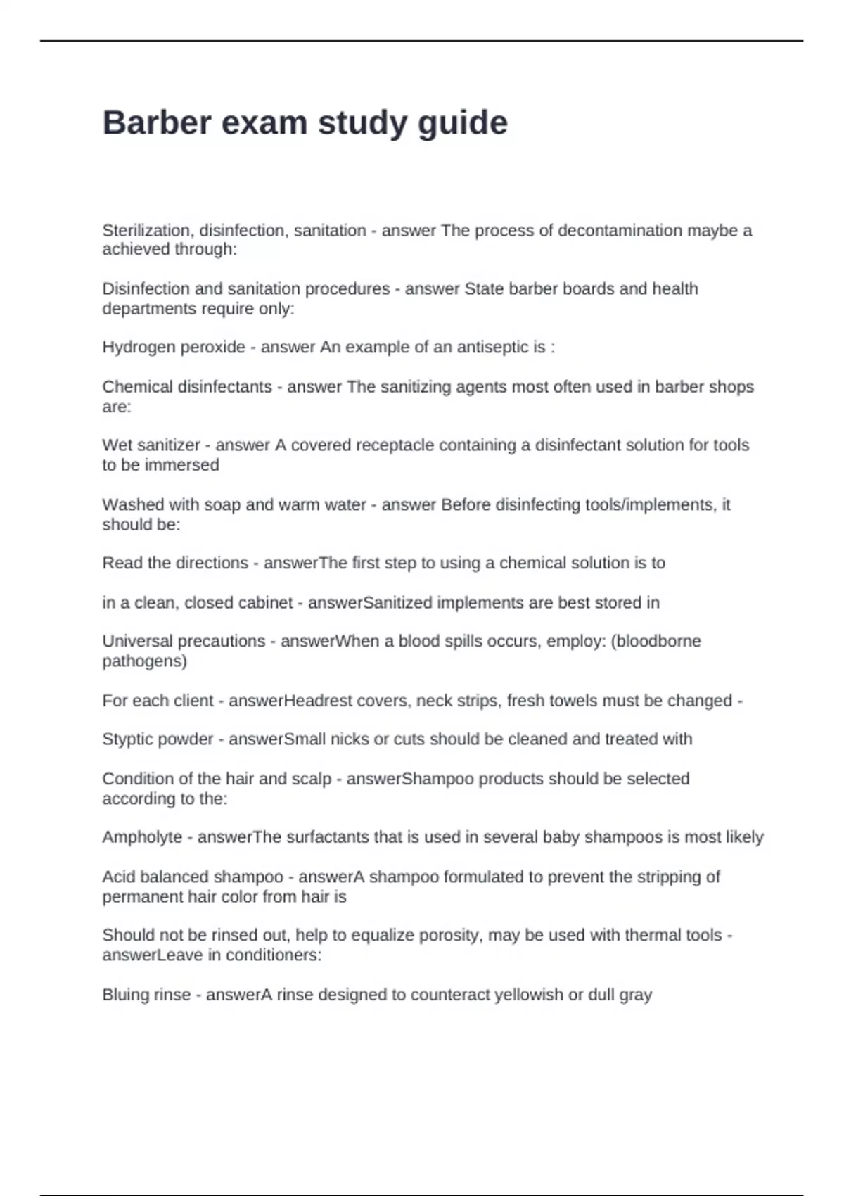 Exam (elaborations) chapter 14 barber Questions and Answers 100% Verified Exam (elaborations) History of Barbering Questions and Answers Correct Exam (elaborations) Barber license exam Questions and Answers 100% Solved Exam (elaborations) RESTRICTED BARBER LAWS QUESTIONS AND ANSWERS 100% SOLVED Exam (elaborations) Barber Pre-Final MN Quest