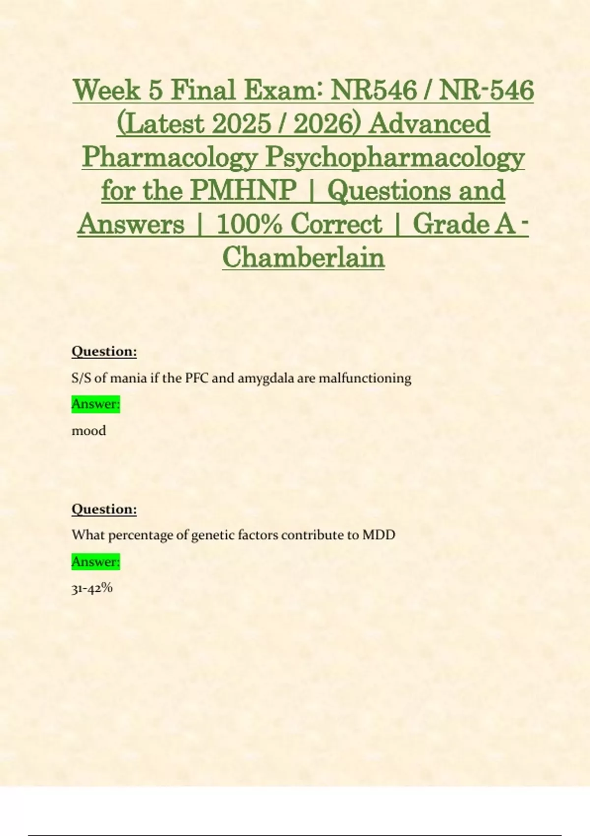 Week 5 & 6 & 7 & 8 Final Exam: NR546 / NR-546 (Latest Update 2025 / 2026 STUDY BUNDLE WITH COMPLETE SOLUTIONS) Advanced Pharmacology Psychopharmacology for the PMHNP | Questions & Verified Answers | Grade A - Chamberlain