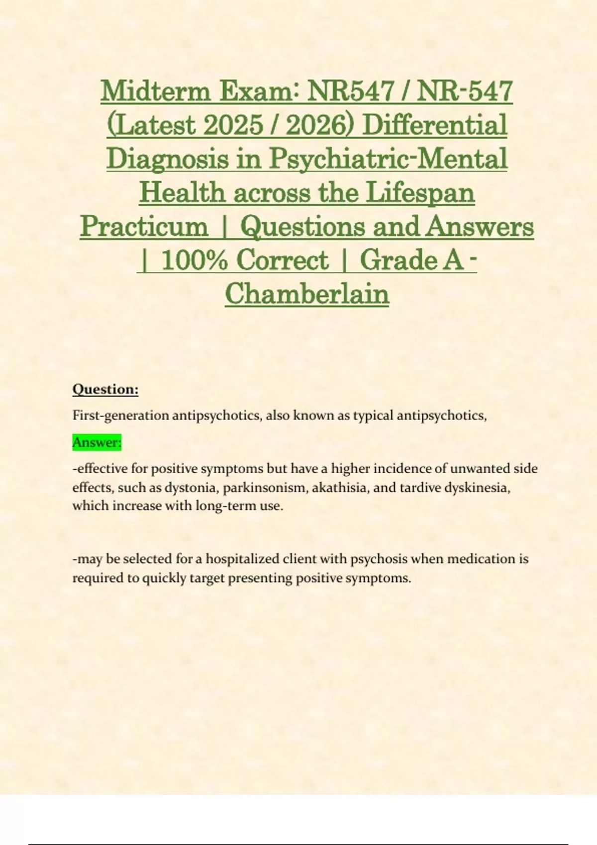 Midterm Exam: NR547 / NR-547 (Latest Update 2025 / 2026 STUDY BUNDLE WITH COMPLETE SOLUTIONS) Differential Diagnosis in Psychiatric-Mental Health across the Lifespan Practicum | Questions and Answers | 100% Correct | Grade A - Chamberlain