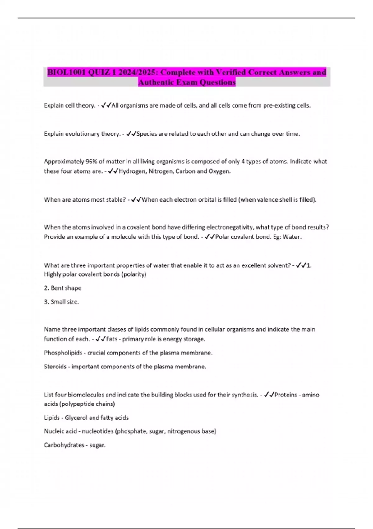 Biol 1001 Ch.8 Questions 2024/2025: Complete with Verified Correct Answers 4 Exam (elaborations) BIOL 1001 Chapter 4 Questions 2024/2025: Complete with Verified Correct Answers 5 Exam (elaborations) BIOL 1001 Chapter 8 Questions 2024/2025: Complete with Verified Correct Answers 6 Exam (elaborations) BIOL 1001 Chapter 9: Cell Communication (2024/202