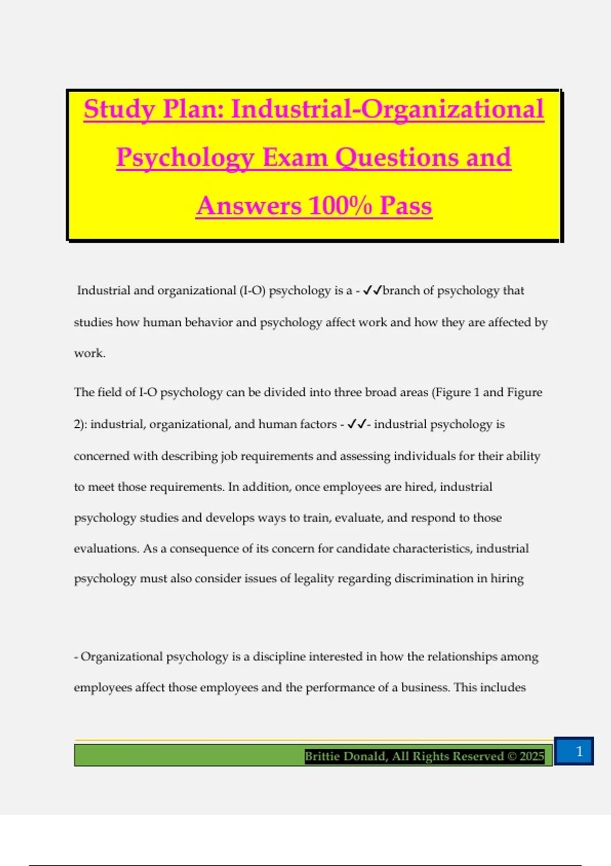 Study Plan: Industrial-Organizational Psychology Exam Questions and Answers 100% Pass