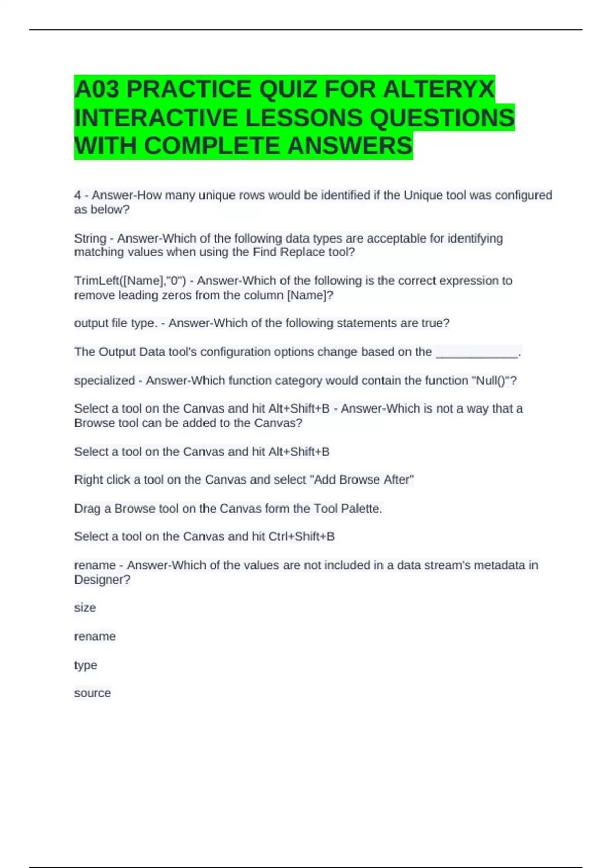 Exam (elaborations) TOOLS OF ALTERYX DESIGNER EXAM QUESTIONS AND ANSWERS Exam (elaborations) ALTERYX TEST GUIDE EXAM QUESTIONS AND ANSWERS Exam (elaborations) ALTERYX STUDY TEST EXAM QUESTIONS AND ANSWERS Exam (elaborations) ALTERYX STUDY GUIDE EXAM QUESTIONS WITH COMPLETE ANSWERS Exam (elaborations) ALTERYX PRACTIVE QUIZ QUESTIONS AND ANS