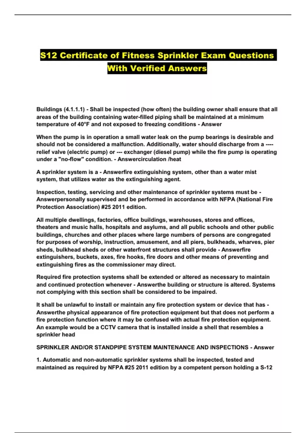 S12 Certificate of Fitness Sprinkler Exam Questions With Verified Answers