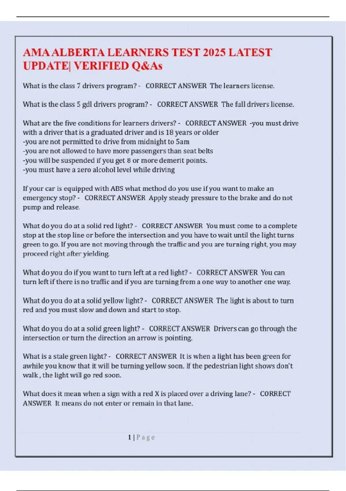 AMA ALBERTA LEARNERS TEST 2025 LATEST UPDATE| VERIFIED Q&As ALBERTA LEARNERS TEST 2025 LATEST UPDATE| VERIFIED Q&AS