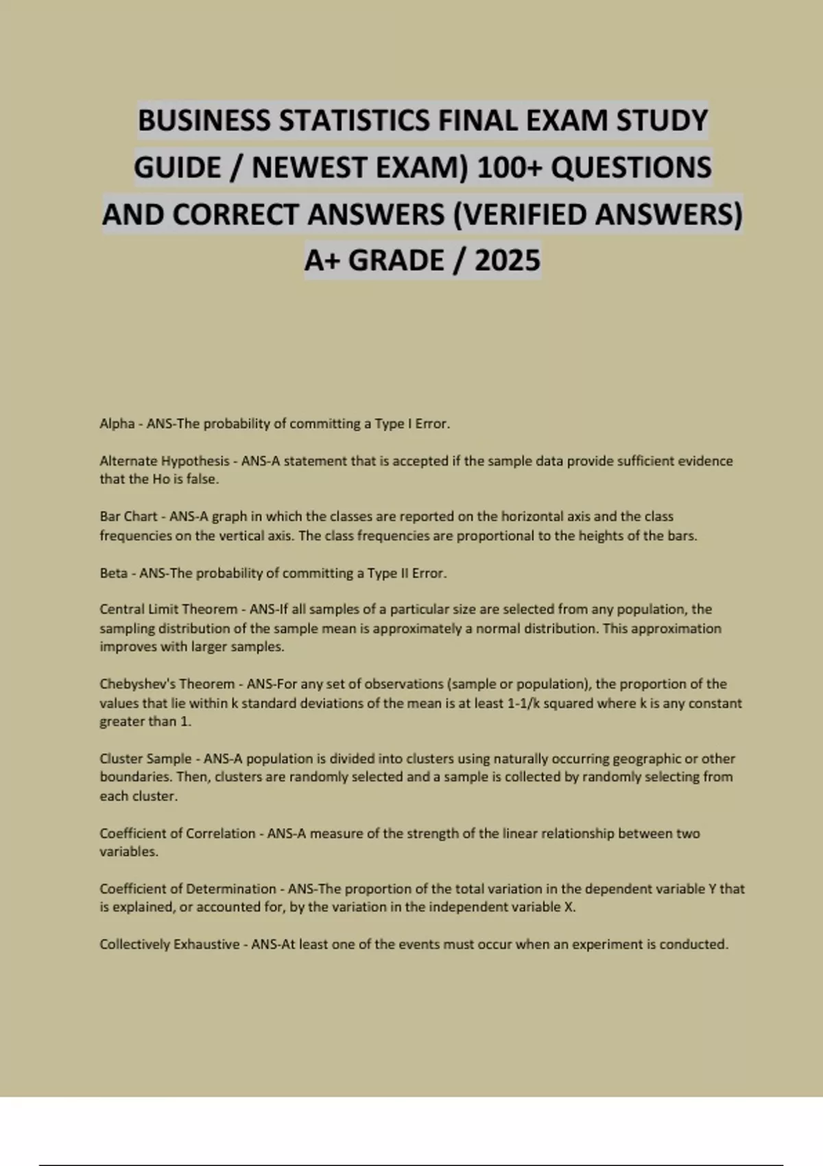 BUSINESS STATISTICS PACKAGE DEAL; QUESTIONS WITH DETAILED VERIFIED ANSWERS / ALREADY GRADED A / 2025
