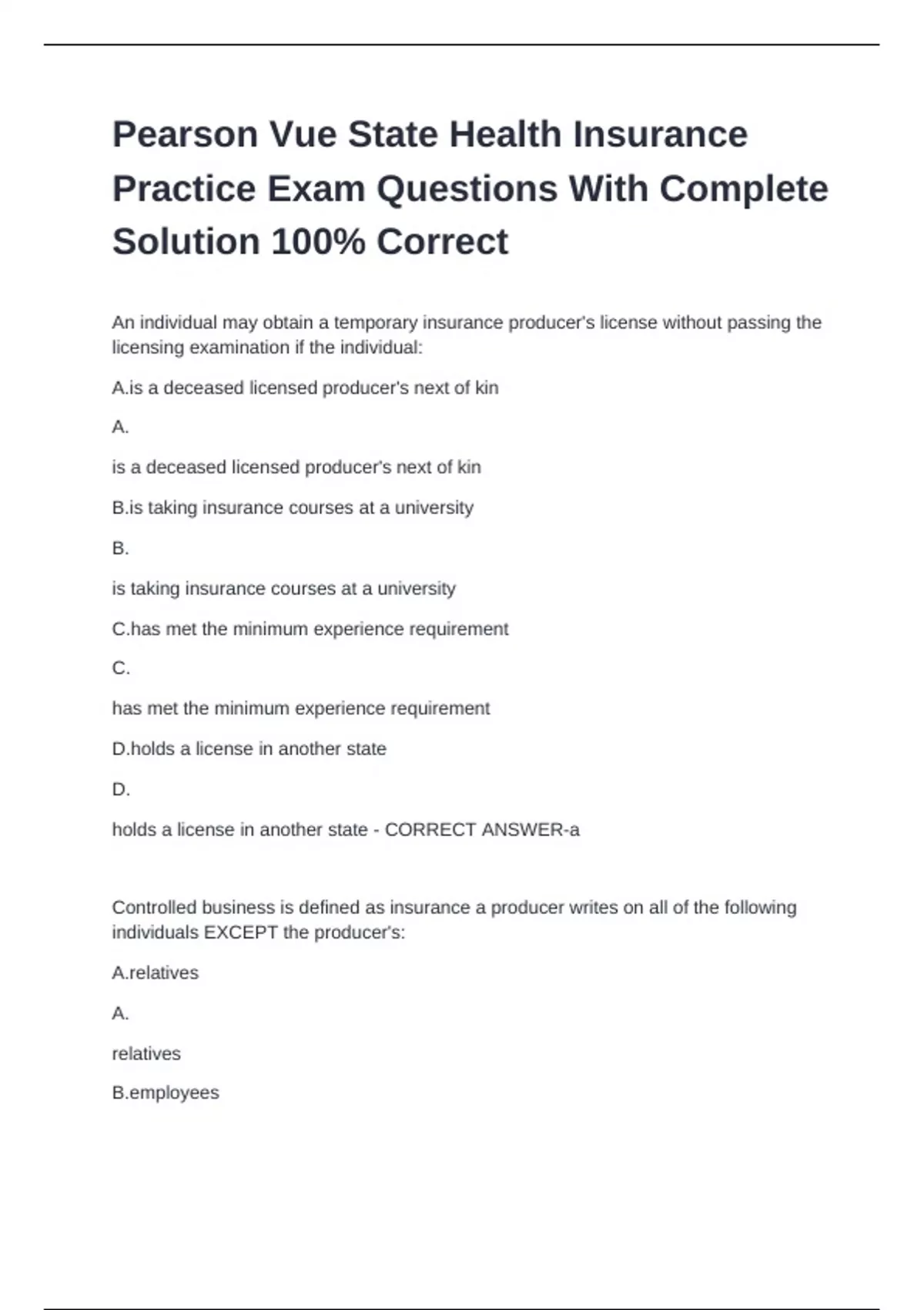 Pearson Vue State Health Insurance Practice Exam Questions With Complete Solution 100% Correct