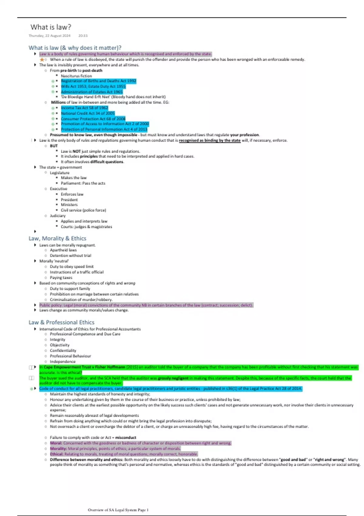 A summary of the lecture notes on all South African Business Law 1 notes, as presented at UCT.