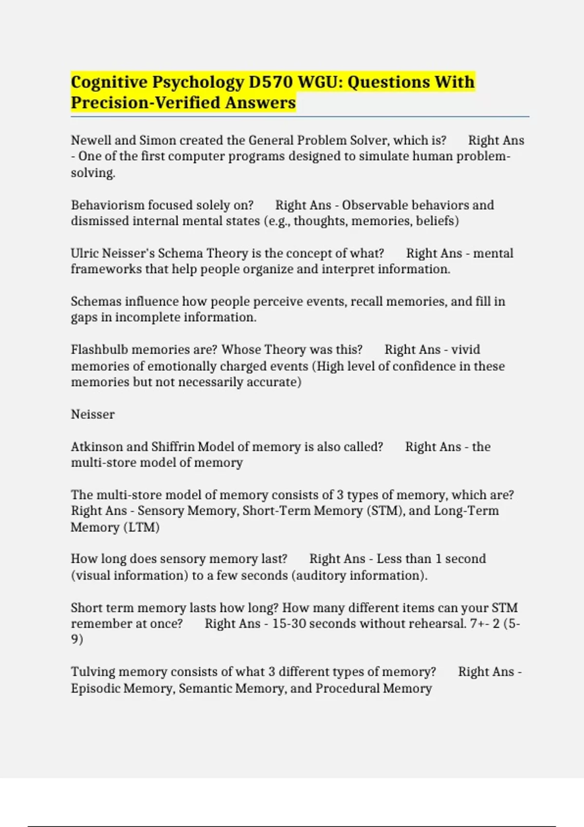 BUNDLE::- WGU D570 COGNITIVE PSYCHOLOGY EXAMS