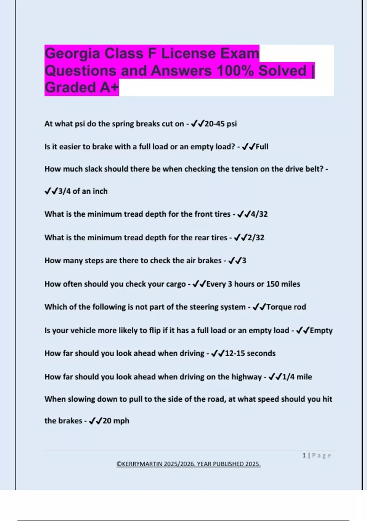 GEORGIA CLASS F DRIVER'S LICENSE EXAM PACKAGE DEAL QUESTIONS AND VERIFIED DETAILED ANSWERS | 100% GUARANTEED PASS | ALREADY GRADED A+