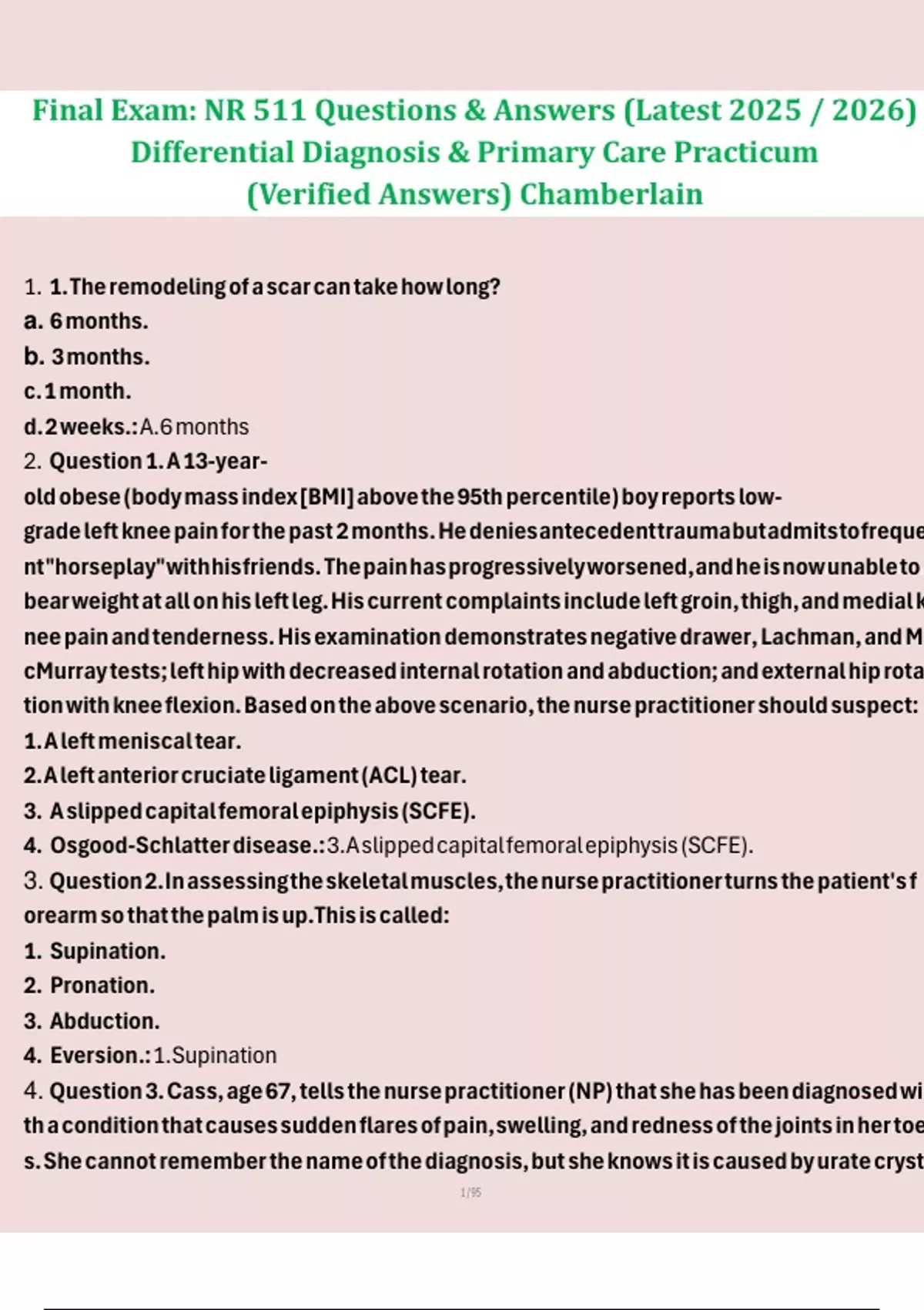 Package deal for NR511 / NR 511 Final Exam (New Update 2025 / 2026) Differential Diagnosis & Primary Care Practicum Questions & Answers (100% Verified)- Chamberlain