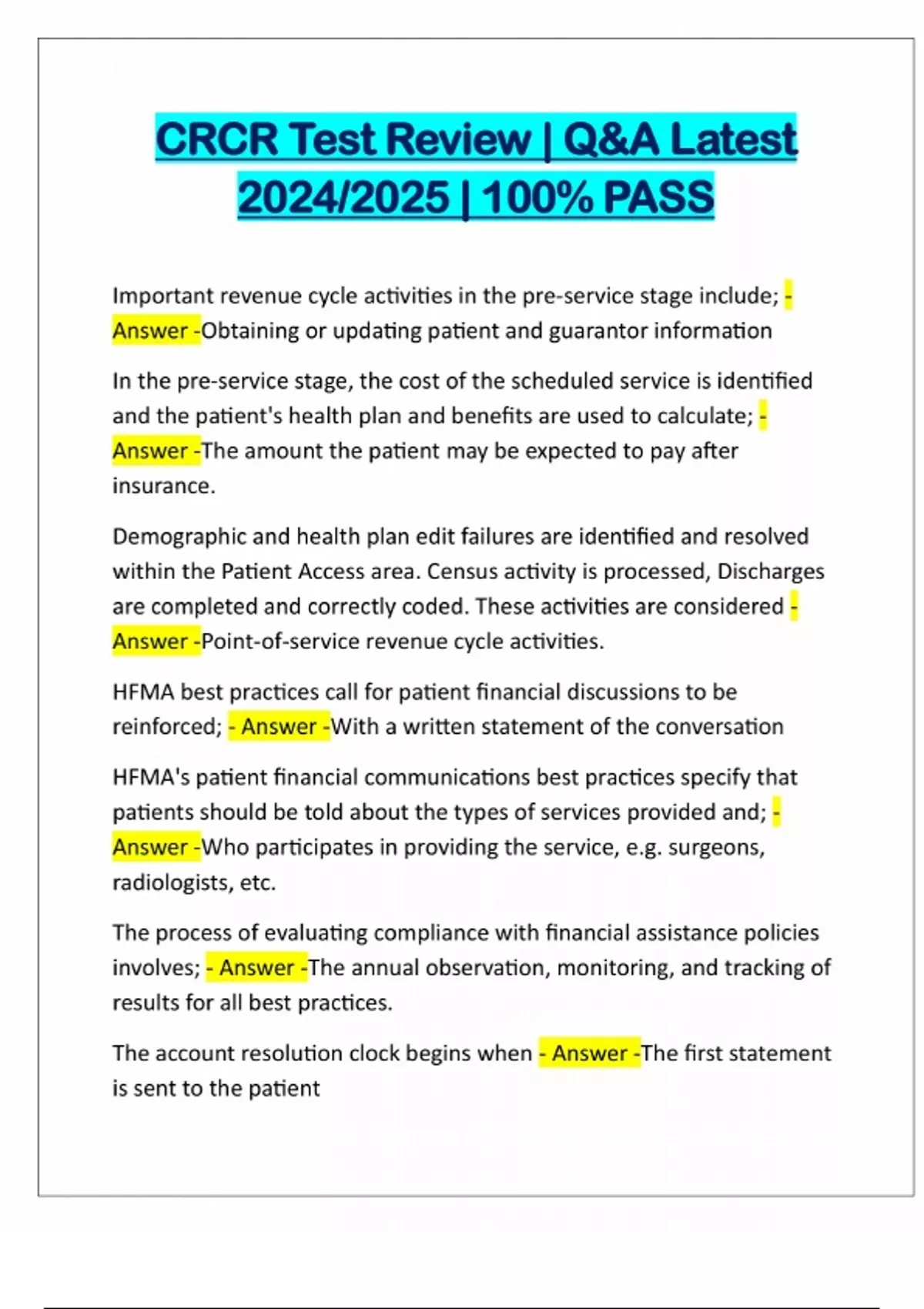 CRCR - CERTIFIED REVENUE CYCLE REPRESENTATIVE PACKAGE DEAL EXAMS | Q&A LATEST UPDATE 2024/2025