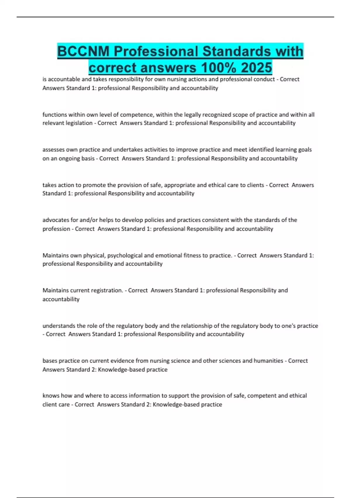 BCCNM Professional Standards with correct answers 100% 2025 is accountable and takes responsibility for own nursing actions and professional conduct - Correct Answers Standard 1: professional Responsibility and accountability functions within own level of competence, within the legally recognized scope of practice and within all relevant legislat