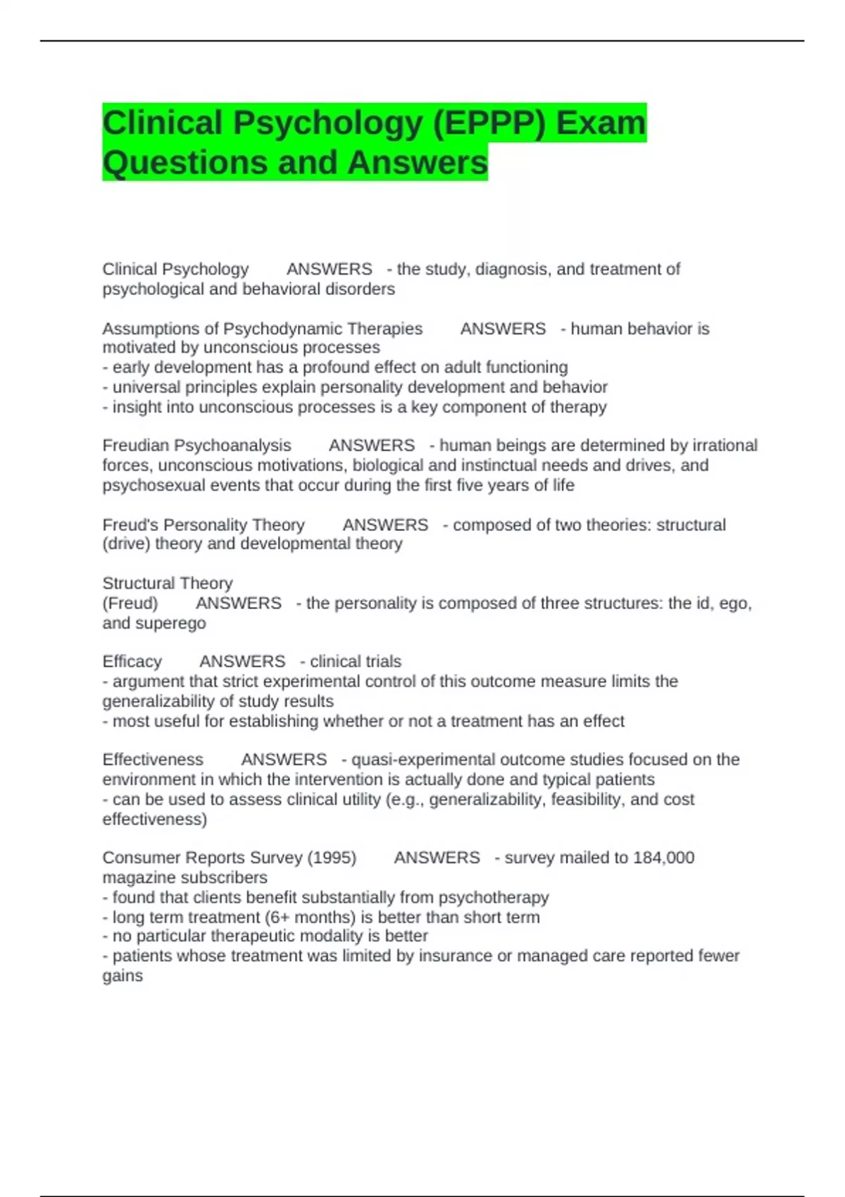 1 Exam (elaborations) EPPP- Psychopathology Practice Questions and Answers 2 Exam (elaborations) EPPP- Ethics Practice Questions and Answers 3 Exam (elaborations) EPPP- Assessment Practice Questions and Answers 4 Exam (elaborations) EPPP Test 6 Questions and Answers 5 Exam (elaborations) EPPP Sample Exam Questions with Verified Answers 6 Exam