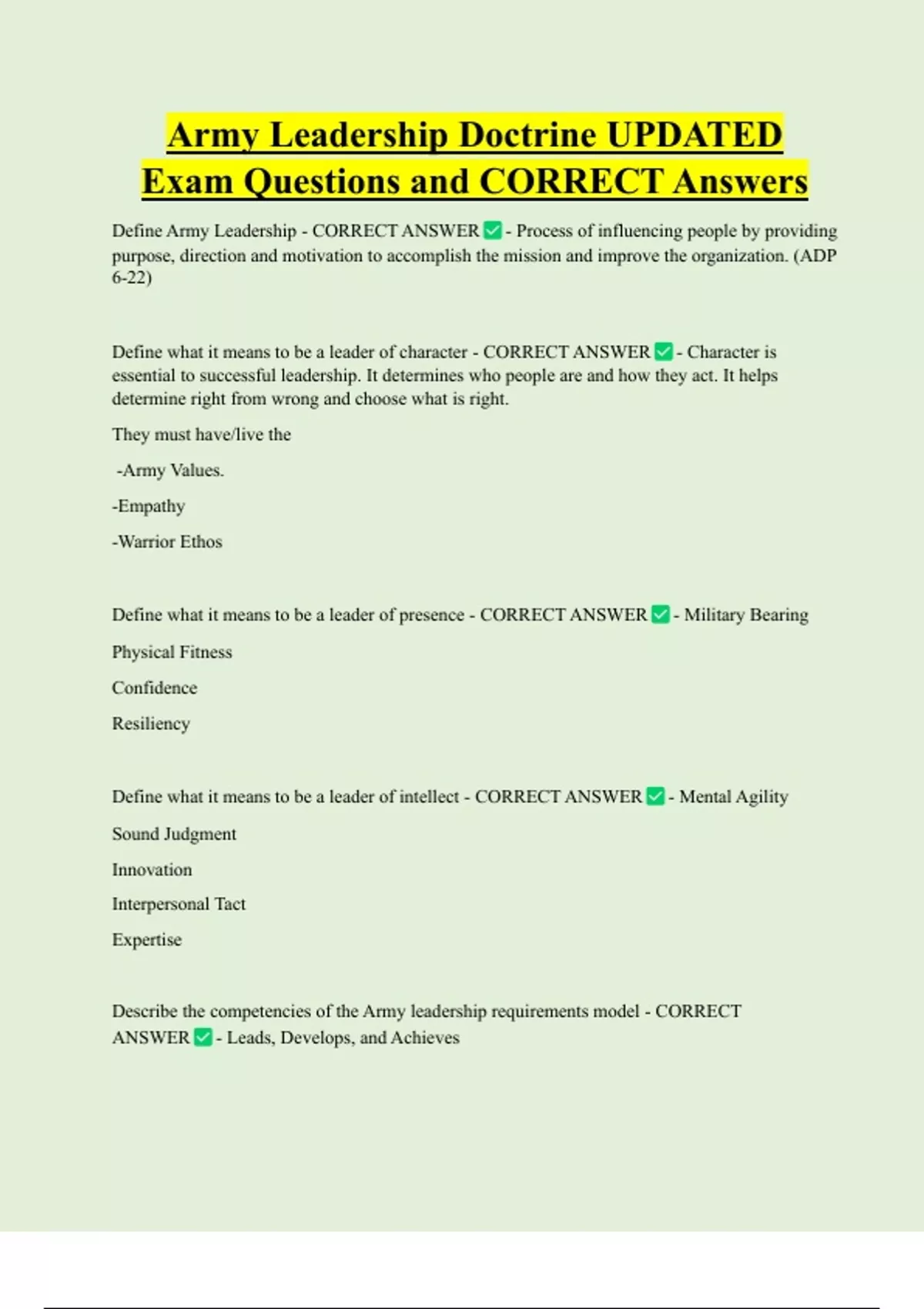 Army Leadership Bundled Exam Questions and CORRECT Answers