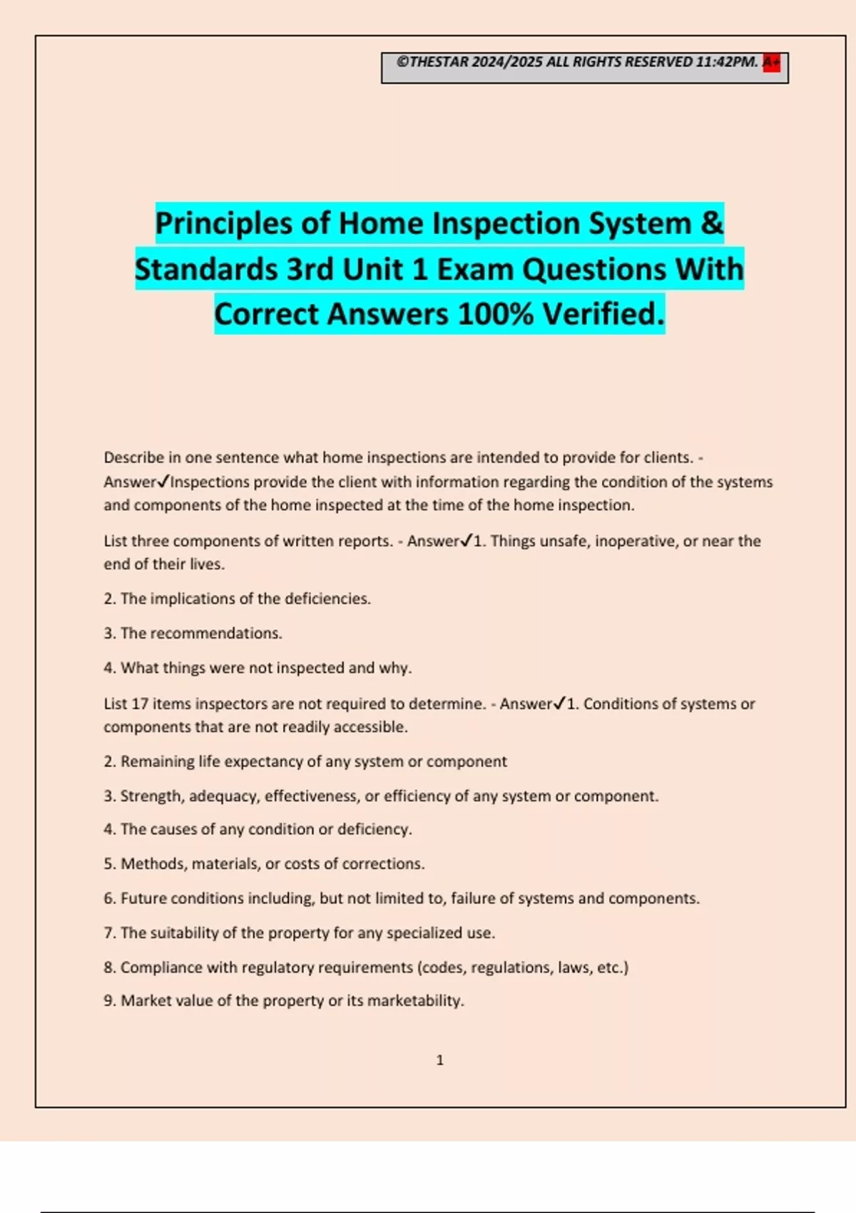 Principles of Home Inspection System & Standards 3rd Unit 1 Exam Questions With Correct Answers 100% Verified.