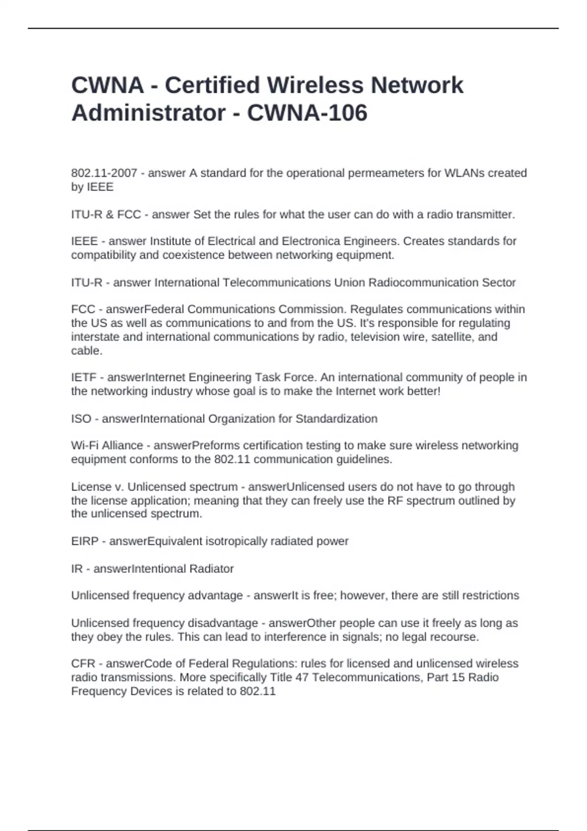 CWNA Chapter 1 Questions and Answers Correct