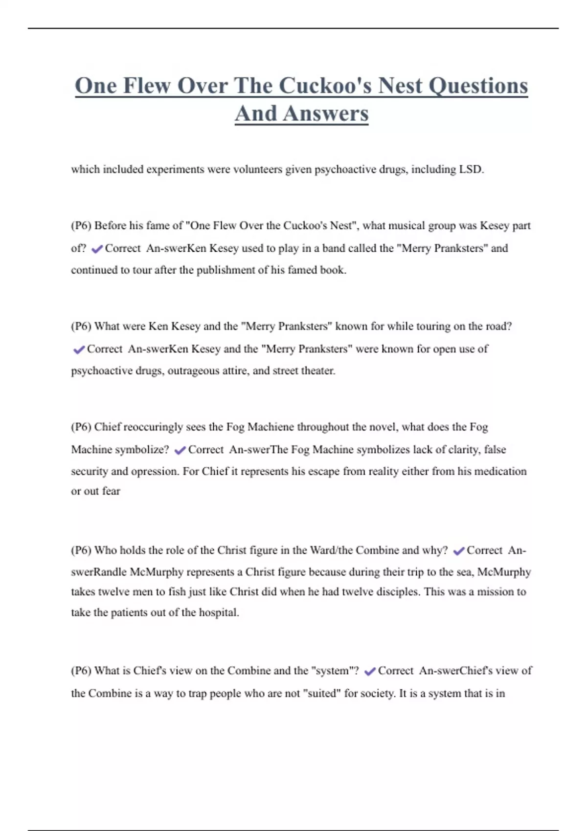 One Flew Over The Cuckoo s Nest Questions And Answers 2 Exam (elaborations) One Flew Over The Cuckoo s Nest Test 2 Study Guide Questions With Complete Solutions 3 Exam (elaborations) One Flew Over The Cuckoo s Nest Test Review! Questions With Correct Answers