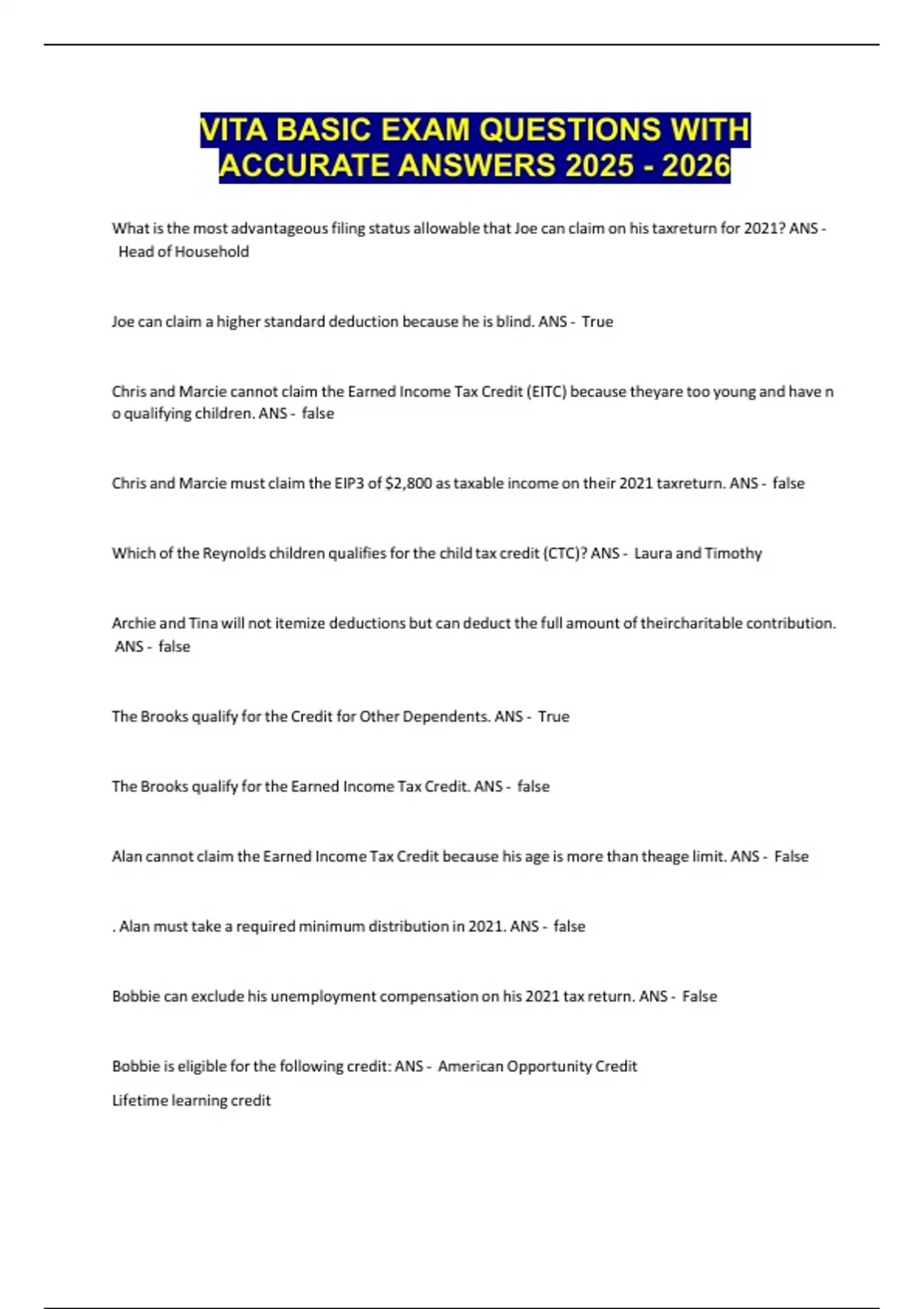 VITA Basic Exam Package Deal | Questions with 100% Correct Answers | Verified | Updated